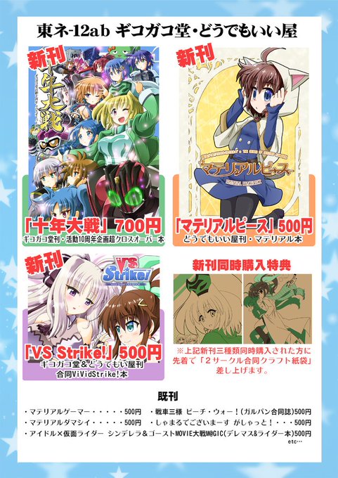 どうでもいい屋・ギコガコ堂、冬コミの御品書き等。ギコガコ堂さんと合同会計です。新刊同時購入で紙袋がおまけにつきます。その他既刊も色々持っていきます。よろしくお願いしますー!