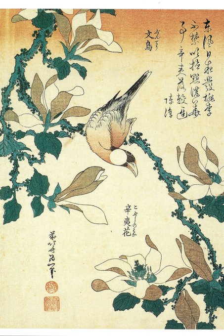 辛夷(こぶし)の枝葉は最小限に省略し、花を引き立てる北斎の技が光る1枚。