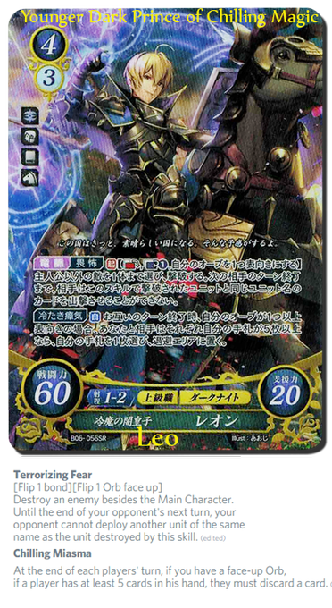 The first card to discard randomly from the opponents hand! A strong back row unit at his release due to destruction not existing and pulls being limited. He did the OC Delthea strat before it was cool!..for 2 bond flips. Happy birthday Leo! #FEcipher
