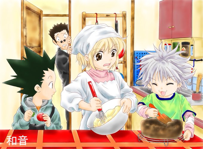 ピカ、キル、ゴンでレオリオのバースデーケーキを作ってる図。