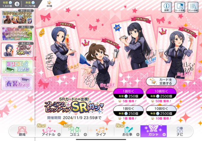 ミリシタのプレミアムSRガシャ 今月の一回勝負 結果はピックアップからnew2枚 バーテンダー 三浦あずささん バーテンダー 佐竹美奈子ちゃん ありがとうございます