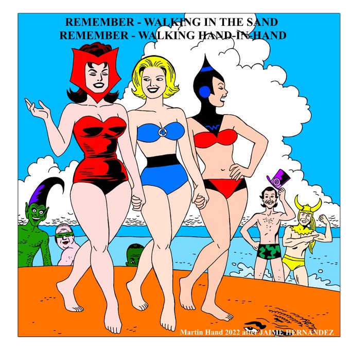 a detail from the cover of STRANGE TALES II no.2, November 2010 (featuring the scarlet witch, invisible girl and wasp plus green goblin, mole man, leader, ringmaster, Loki & sandman) - versus the SHANGRI-LAS - after the great JAIME HERNANDEZ :)