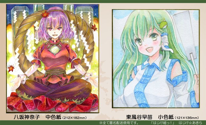 #毎週東方色紙 本日23時30分より新作直筆色紙4枚をBOOTHに出品致します。中色紙→八坂神奈子 小色紙→東風谷早苗、小色紙&紙コースター→洩矢諏訪子、旧作アリス 作品ページは21時頃より公開です。どうぞよろしくお願い致します~ https://t.co/588GLWud3P