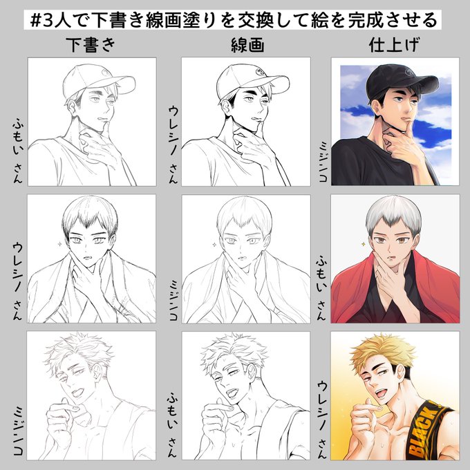 #3人で下書き線画塗りを交換して絵を完成させる