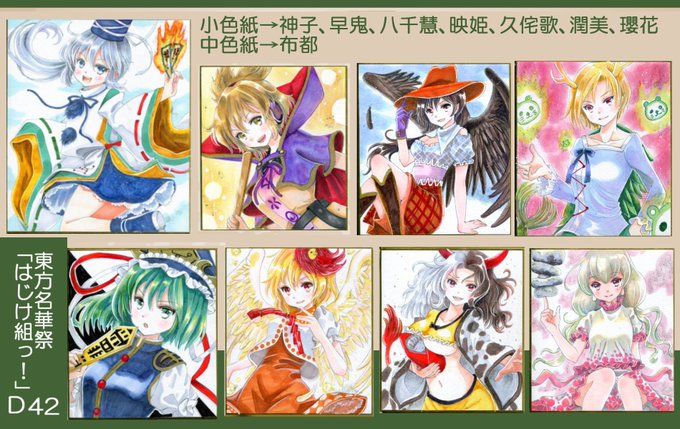 8/9東方名華祭14のおしながきです。「はじけ組っ!」D42で参加です。新刊はありませんが「鬼形獣1周年記念色紙祭り」として鬼形獣全キャラの色紙と布都、神子の色紙等大量に持ち込みます。サンプルにありませんが大色紙→布都、袿姫も予定。(残部は後日BOOTH出品します)どうぞ宜しくお願いします~