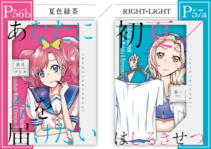 そして、P-56b「夏色緑茶」の放見ナシカさん(@hoozuki_nasika)は、まどかちゃんサイドで「あなたに今を届けたい」というお話です。リバーシブルなので、ふたつ合わせて一冊の本となります。