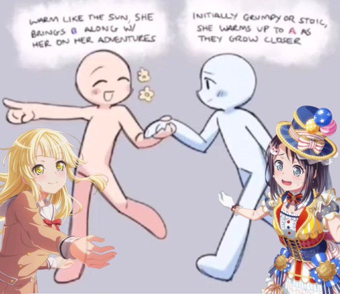 bandori rarepair otd is misari! this ship consists of misaki from harohapi and arisa from popipa!! they both are similar but also not, and their casual friendly convos are the best bc it doesnt feel awkward! they also have food dates with each others groups!!