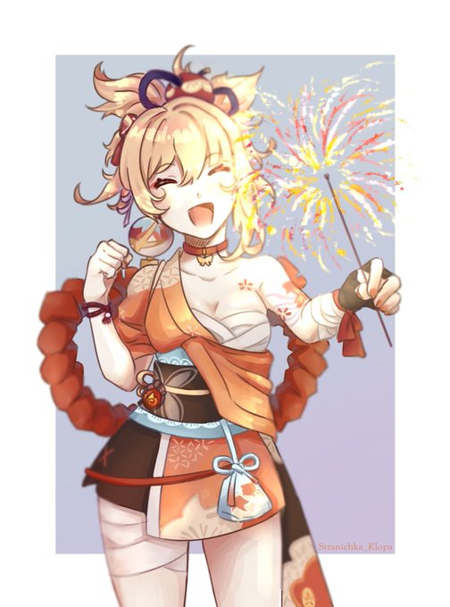 Hello!! Today is the last day of Yoimiya time! She's so cute and funny so give her some love! This is a drawing I made for her but I had a lot of help for the background by my gf! Thanks to her!