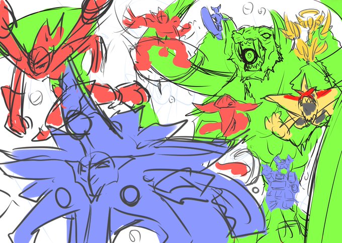 マギレコのまどマギscene0を読み終えた記念と、デュエプレで初のマスター到達した記念に集合絵を描いている(いっぺんに!??!?)