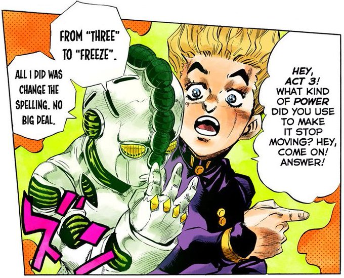 @JolyneIV @Rodrigator_ @invaderzzzz @JJBAmanga Well in part 4 he mentions "oh Freeze sounds like 3 so that's how it do" the English translation kinda makes it he just changes the spelling but it's the rhyming thing in Japanese