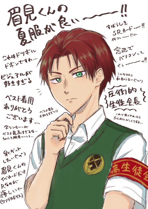 1枚目英雄が左利きだと気づいたのは最後の仕上げの時だった、、2枚目はたろりにすとの好きなポーズと衣装で肌と瞳を頑張った。3.4枚目は描き殴っただけのやーつ。