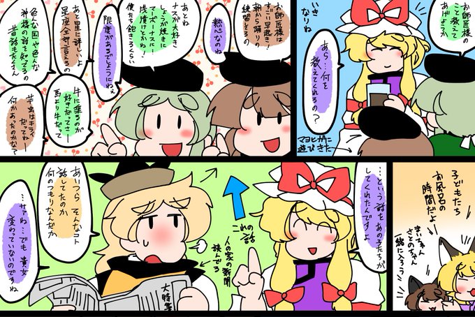 おきゆかっぽい漫画。サイズでかくて台詞読みにくいので4枚に分割してます。紫様はよっぽどのときでないと負け戦はしないので、隠岐奈様にはある程度勝算を持って臨んでいるのですよ。