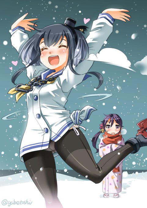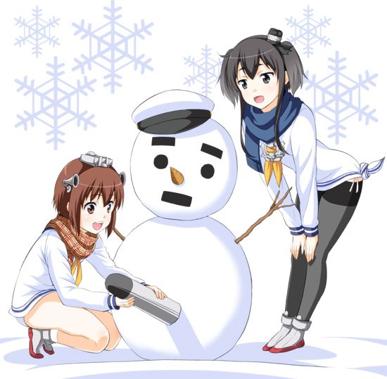 雪降ってるから、雪だるま作ってる雪風と時津風。