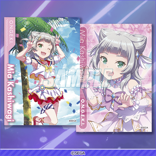 Se presentan cartas [SSR] Kashiwagi Mia [Rainy Colors] y [SR] Shinonome Tsumugi [Amefuri Emotional] que jugadores pueden obtener en gacha "Colorful Umbrella" a partir de mayo 26 en ONGEKI bright MEMORY.