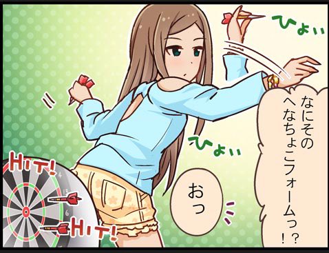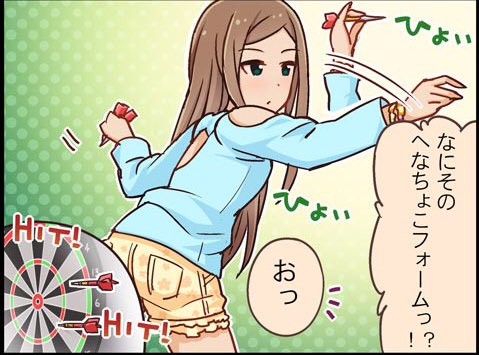 矢口美羽が謎のみうさぎの舞を踊り、本田未央が謎の風乞いの踊りを踊ったことで松山久美子にも謎ダンスが期待されているけれど、久美子さんだってへなちょこフォームでダーツ投げたりしとるからな