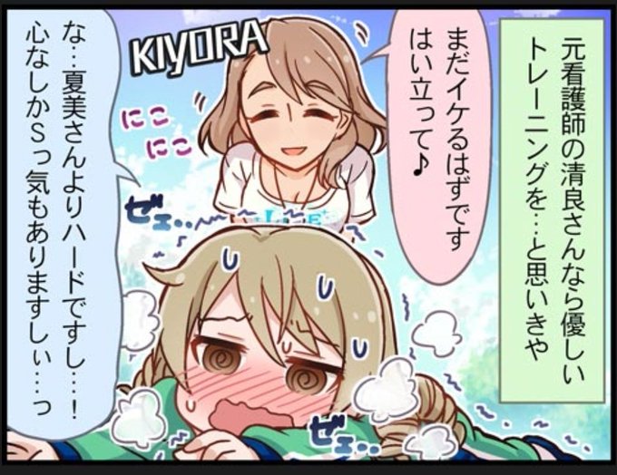 潔癖症であるが故に女性だけの職場で触れられることのないようにお山を殊更強調する棟方愛海と、そんな彼女のサポートを担当Pに依頼されているためゴム手袋をキュ……とする柳清良さん。