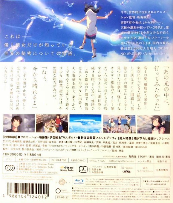 高1の夏。 離島から家出し、東京へやって来た帆高。 怪しげなオカルト雑誌のライターとして働きはじめた彼は、空を晴れに出来る不思議な力を持つ少女 陽菜と出合う
