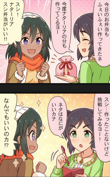 駅で売ってる弁当だな!各地の特色が出てるからどれもユニークで美味しそうなものになっているぞ!ナターリアも料理が得意なフェイフェイちゃんにお弁当の中身を提案してたな!スシ弁当は流石に作ったこと無いようだけどチャレンジしてみるみたいだ!