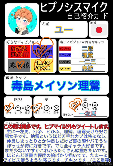 ヒプマイ自己紹介カードお借りしました!フリースペースごちゃごちゃ書いててすみません…!🎤絵描きさん、理鶯くん推しさん、その他趣味合いそうな方と繋がれたら嬉しいです!\( ´˘`)/