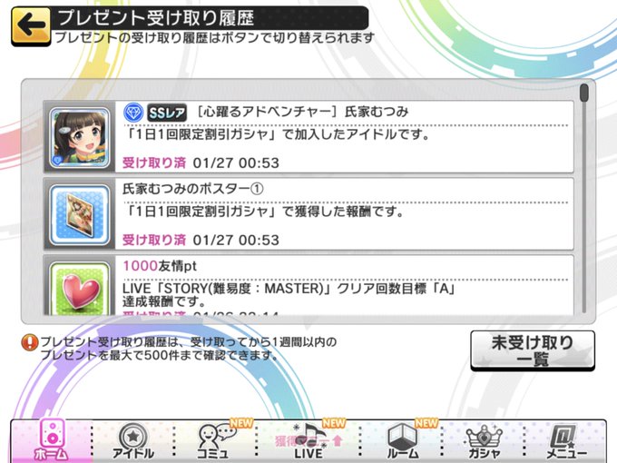 1月はフェス上位雪美に始まり、ちゃまリミテ+小春ちゃんロワ、関ちゃんはRで安心と思ったのも束の間むつみちゃんがSSR大抜擢と、中々忙しい月だったが楽しかった。しかも、きっちり全員お迎えできている喜び。来月も頑張ろう