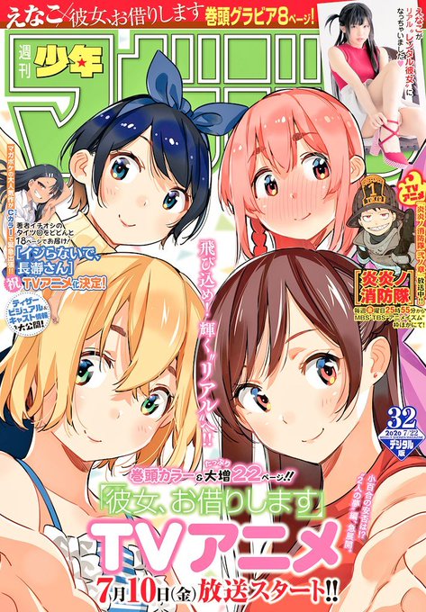 Дівчата з "Kanojo, Okarishimasu" (Дівчина напрокат) на обкладинці 32-го номеру журналу Weekly Shonen Magazine з нагадуванням про те, що аніме адаптація стартує 10-го липня.