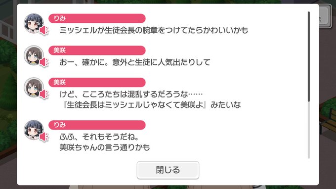 そう言えば生徒会長の腕章とかあるのか…そんなめっちゃ目立つ腕章を付ける奥沢美咲さんなかなか面白だな、と思ったけど白金さんのイラスト見るに特に腕章付けてる雰囲気はなかった。風紀委員が腕章を付けてるイラストはあったが…どうなの奥沢美咲さん?