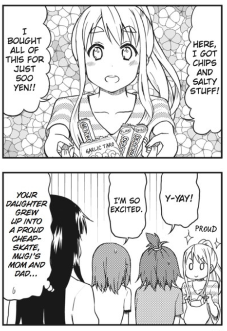 In the college club room there is a white board which they definitely would have dawn all over that like in high school. Had fun thinking what to put. Also Mugi ends up buying cheap snacks a lot so that's what's on the table