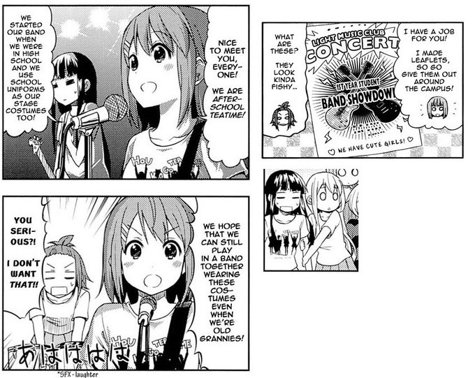 Fast forward about 6 months to the seniors in college and they have their 1st year's band showdown and the outfit they wear is like the 3rd school festival but with them 4 holding Hou Ka Go Tea Time from photos Yui took earlier
