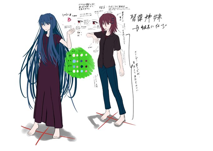 画像漁ってたら見つけたから再掲。 なるべく原作寄せで描いた琴葉姉妹と このふたり広義の黒髪じゃないかという仮説で明度落としてゴリゴリにアレンジ入れた琴葉姉妹