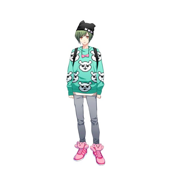 shoes from one of his casual sets, the outfit featured in his unbloomed SSR [Willful Cat]. and ofc Washimiya’s iconic pompom and heart megaphone in [First Crush Baseball/Love out of Left Field]
