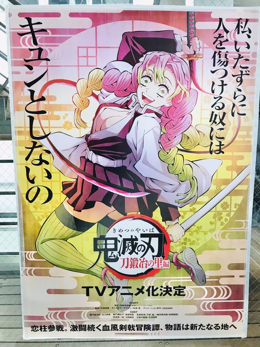 店内に刀鍛冶編のポスターがあったから、まぁ撮影するよね‼️そしてもちろんアップするよね😍❣️あああああああかわいい蜜璃ちゃんかわいいよぉ🥰💖かわいいかわいい好き大好き☺️🌸むいくんカッコ良いー😳⁉️え、アップの破壊力やばい😇こんなん、動くむいくんの戦闘シーンに今からソワソワするんだが👏🎊