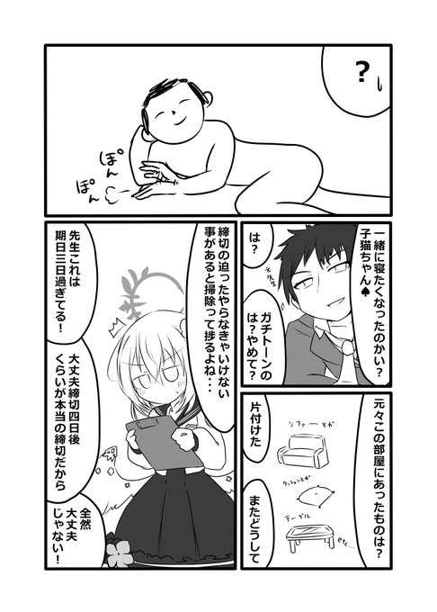 不備がなければひとまずの脱稿!ってことでC102はアズサと先生がなんか片付けられて真っ白になったシャーレ休憩室で漫才しながら最後いい感じに仕事を終わらせる漫画描きました!