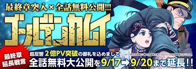 『#ゴールデンカムイ 』史上最大の全話無料大開放は本日≪9/20(月)まで≫です。
