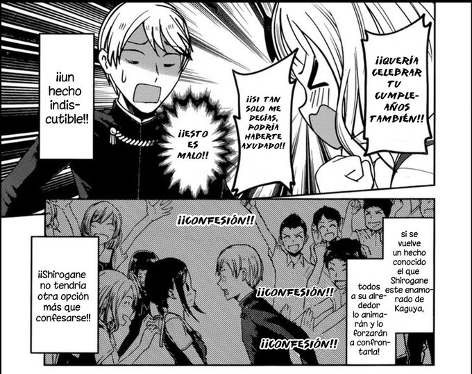 Shirogane es arrinconado por Kaguya y responde directamente para dar vuelta la situación a su favor.. en el manga él piensa que la confesión es inevitable y luego de la explicación del narrador, contraataca 😅