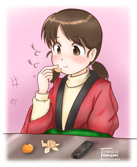 こたつでみかんを食べながらのんびりテレビを見ている白雪さん。