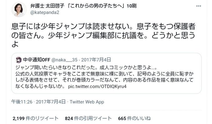 太田啓子は取り巻きのひとりである、中が電子版の試し読みからアップしたらしい、週刊少年ジャンプ2017年31号の画像を見て、そのツイートを引用して《息子には少年ジャンプを読ませない》と宣言したのだが、表紙で銀魂実写版を宣伝した翌32号を含めて鬼滅の刃も連載中だった。 https://t.co/G1JwloGVQb