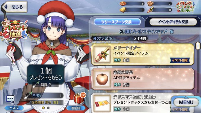 期間限定イベント「メイキング・クリスマス・パーティー!」のイベントアイテム交換は、明日12月24日(金)12:59で終了となりますのでご注意ください。詳しくは→https://t.co/t9puZcT0x7 #FGO