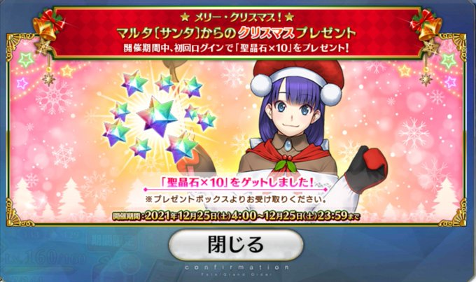期間限定イベント「メイキング・クリスマス・パーティー!」のイベントアイテム交換は、本日12月24日(金)12:59で終了となりますのでご注意ください。詳しくは→https://t.co/t9puZcT0x7 #FGO