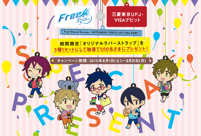 【8月1日から!】「Free!-Eternal Summer-」と三菱東京UFJ-VISAデビットのコラボが復活!5人のオリジナルラバストを1セットにして抽選でプレゼント!お見逃しなく! http://t.co/7qjsHO8Klk