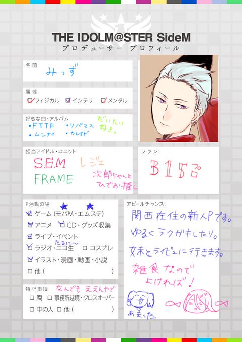 プロフちょっと更新しました。ラクガキ量産マンです。反応ありましたら巡回させていただきます(/・ω・)/ #MマスPプロフィール #Mマス好きな方と繋がりたい