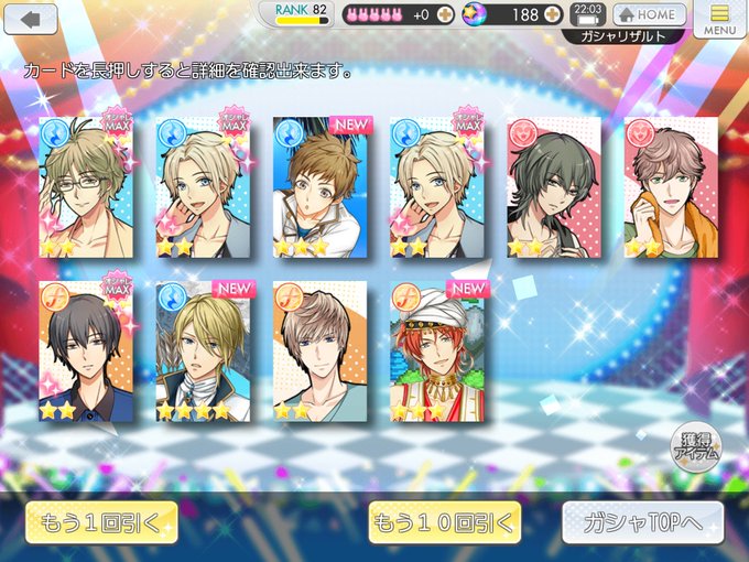 確定はなんと新!!!! ツキパラに関しては恋がまったくデレねぇ!!!! 卯月ガード入る!!!! ガチャチケ10連は踊り子陽くんがきてくれて我満足。