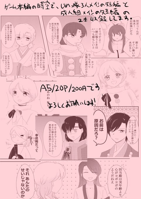 本編時空でじれっ隊の3人メインの話と、成人組5人メインの話のガチで短い短編が2本収録されてます!じれっ隊は皆でうしろ向きをしていて、成人組のほうは勝真がひたすら突っ込んでます。花梨はどっちも出ます。A5/20P/200円です。よろしくお願いします!