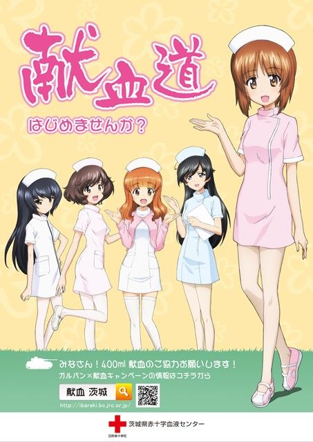 The temporary nurses of the day are the Girls und Panzer characters promoting a blood drive a few years back.