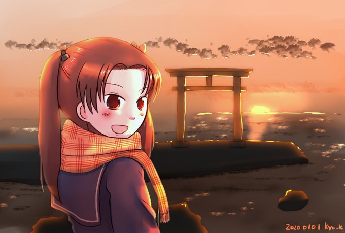 #ガルパン版深夜のお絵描き60分一本勝負 #ガルパン版深夜のお絵描き60分一本勝負_20200101 お題テーマ「初詣」「初日の出」というわけで磯前神社の初日の出な角谷杏さん。