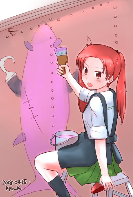#ガルパン版深夜のお絵描き60分一本勝負 #ガルパン版深夜のお絵描き60分一本勝負_20180415 お題「サメさんチーム」のマークを描く角谷杏さん。カイゾク戦車、思いもしない登場に驚きました。