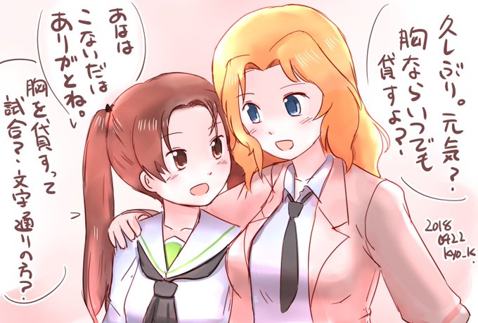 #ガルパン版深夜のお絵描き60分一本勝負 #ガルパン版深夜のお絵描き60分一本勝負_20180422 お題「サンダース大学付属高校」のおケイさんとアンジー!Variante2巻8話のケイ杏みてから絡ませて描きたかったんですよ!尊い…!