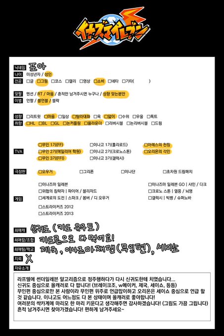 #이나이레_트친소 #이나즈마_트친소 이렇게 적었지만.. 진짜 저 다 먹는거 같아요.. 브레이크조, 펭귄 3호조.. 아니 뭐 그냥 다 좋아하는거 같아요... 그냥 애들보면 기분이 좋아져요... 수호 왼, 귀도른위주로 먹긴합니다만 저와 친구하실분? 근데 저 맨날 애들 보고 울부짖는거 감안해주세요...😂