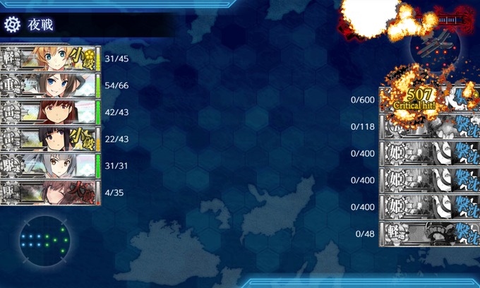 空襲を輪形、Nを第四、R1を第一、R2を第二。支援なし。東海部隊をR1(幼女)、陸戦1陸功3をN(半径ミス)。R2にはヌの連合がいるが斉射無くても基本は壊滅する。