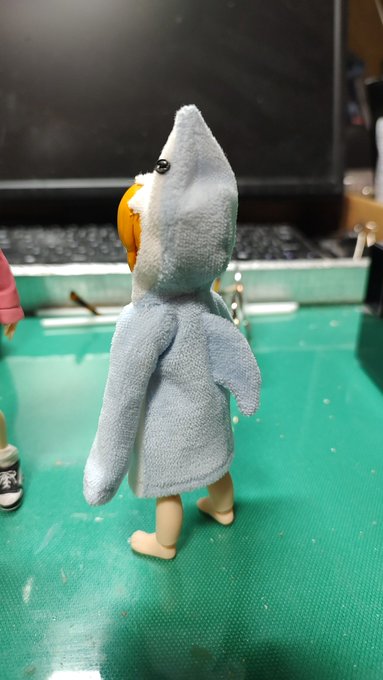 サメ好きな子なので、なんとか着せてやりたいと悪戦苦闘。