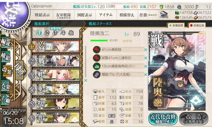 なお、神通もケッコン寸前まで行っていました。幸か不幸か宗谷掘りがあっさり終わったのでLv99にちょっと足りませんでしたけどね。
